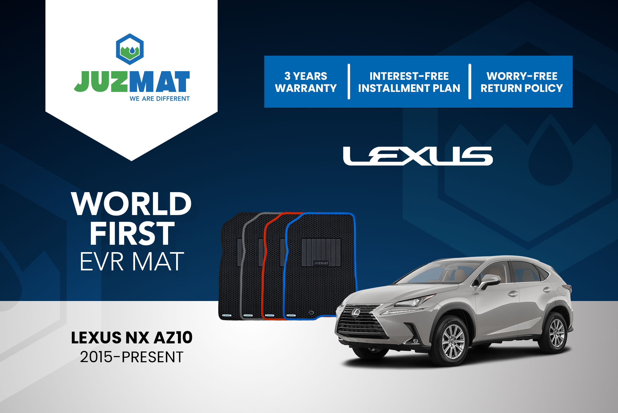 All our car mats are made to measure to ensure the perfect fit for your specific model. Juzmat EVR mat is 10x more durable than your regular mat. Shop confidently with our 3 years warranty promise!