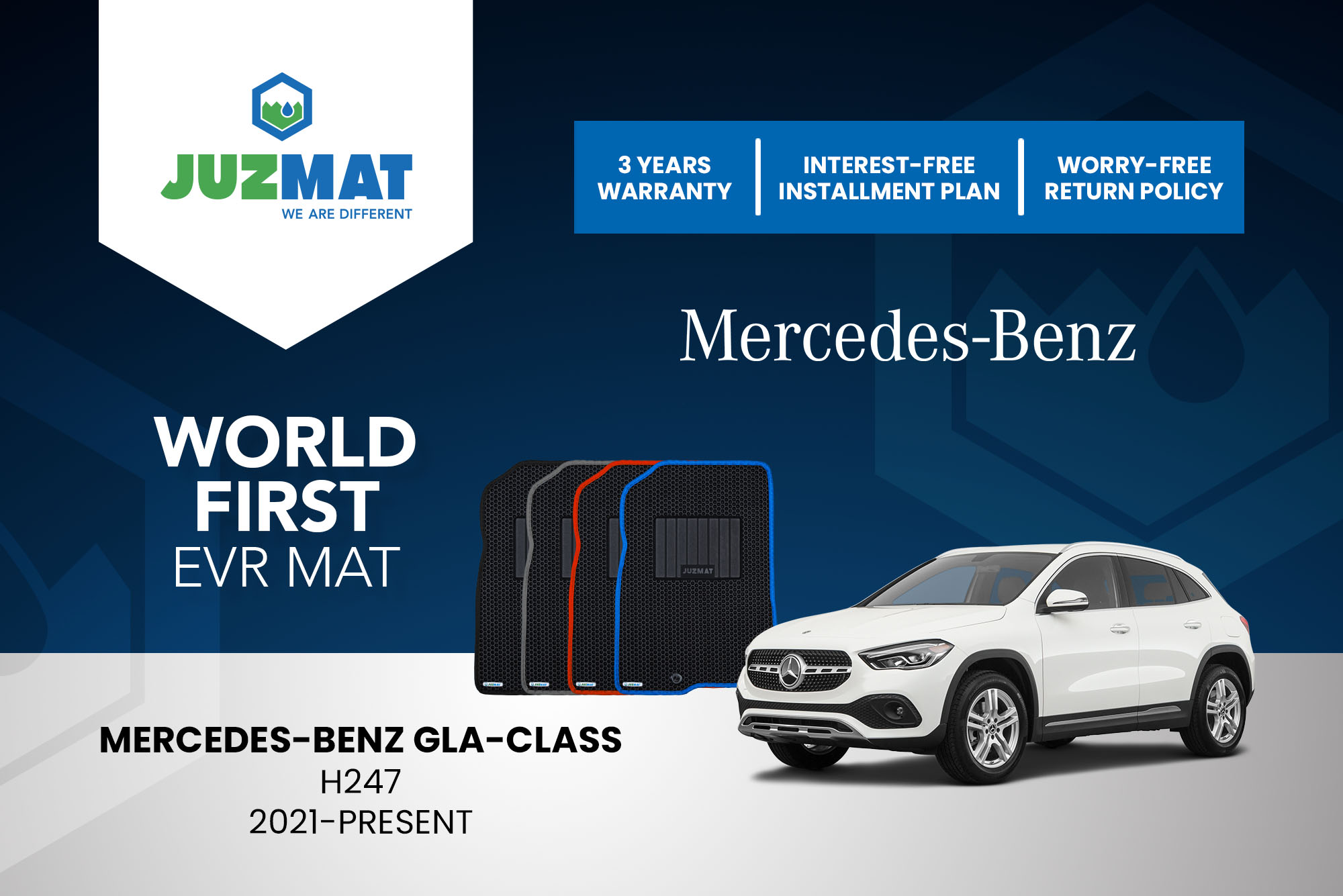All our car mats are made to measure to ensure the perfect fit for your specific model. Juzmat EVR mat is 10x more durable than your regular mat. Shop confidently with our 3 years warranty promise!