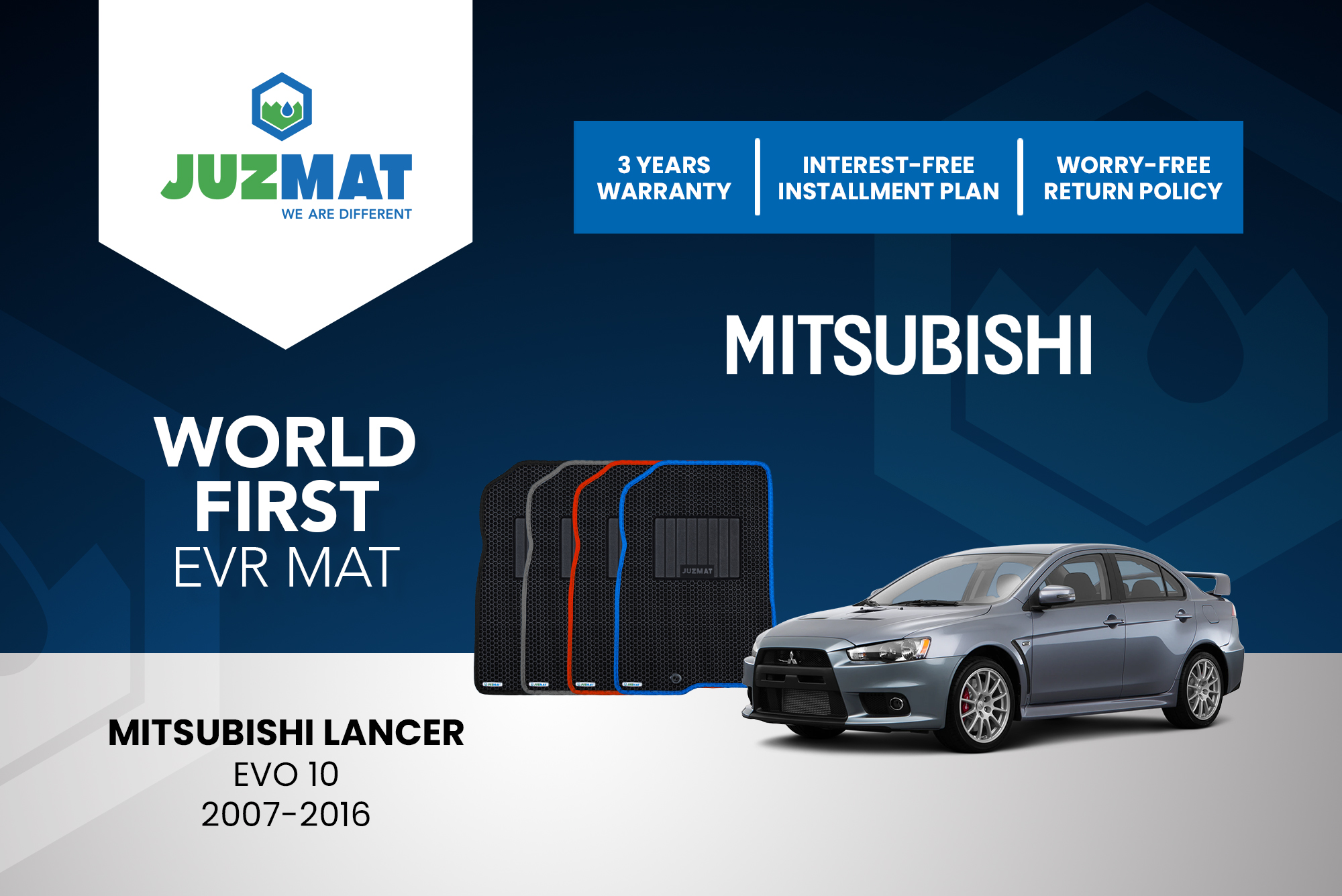 All our car mats are made to measure to ensure the perfect fit for your specific model. Juzmat EVR mat is 10x more durable than your regular mat. Shop confidently with our 3 years warranty promise!