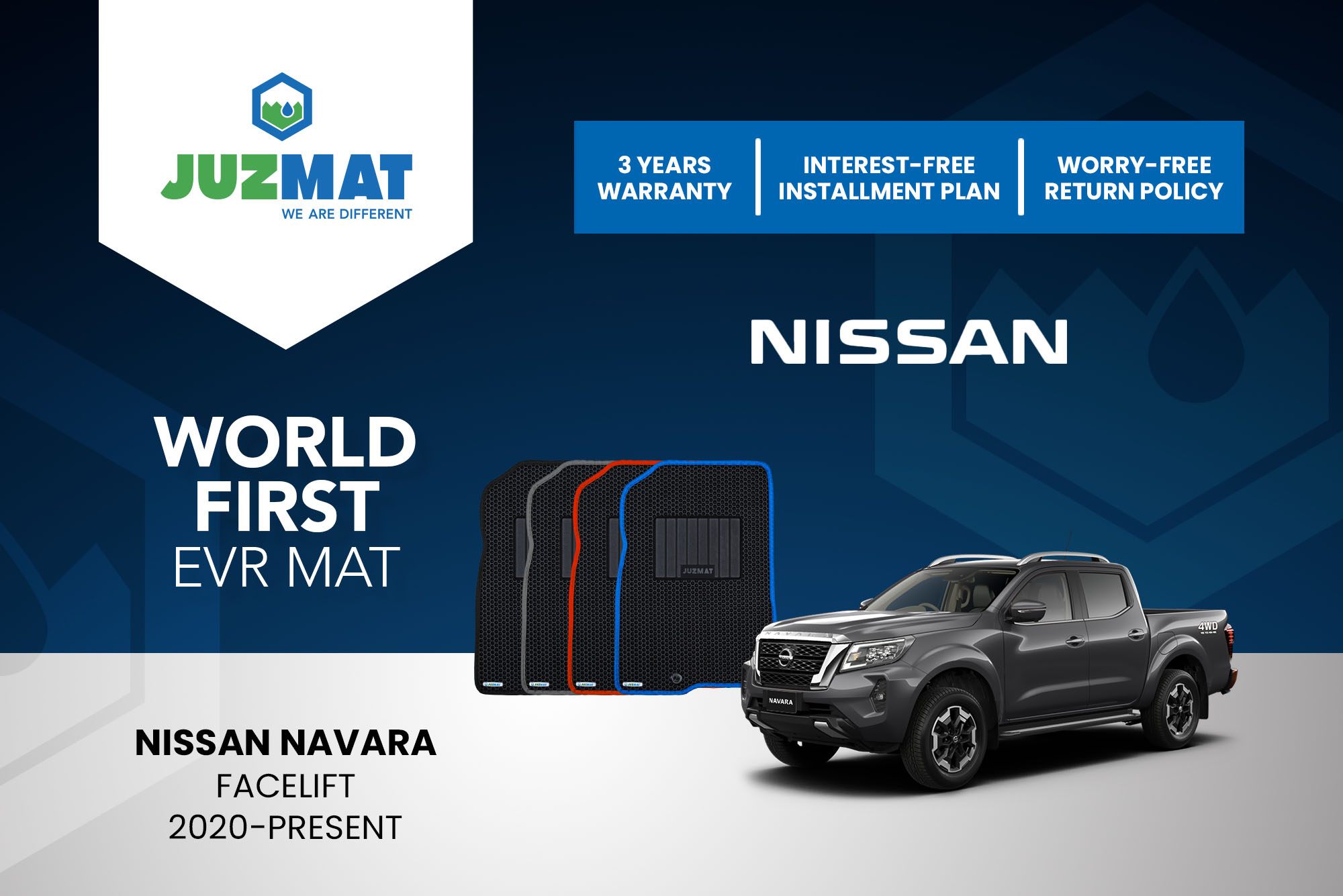 All our car mats are made to measure to ensure the perfect fit for your specific model. Juzmat EVR mat is 10x more durable than your regular mat. Shop confidently with our 3 years warranty promise!