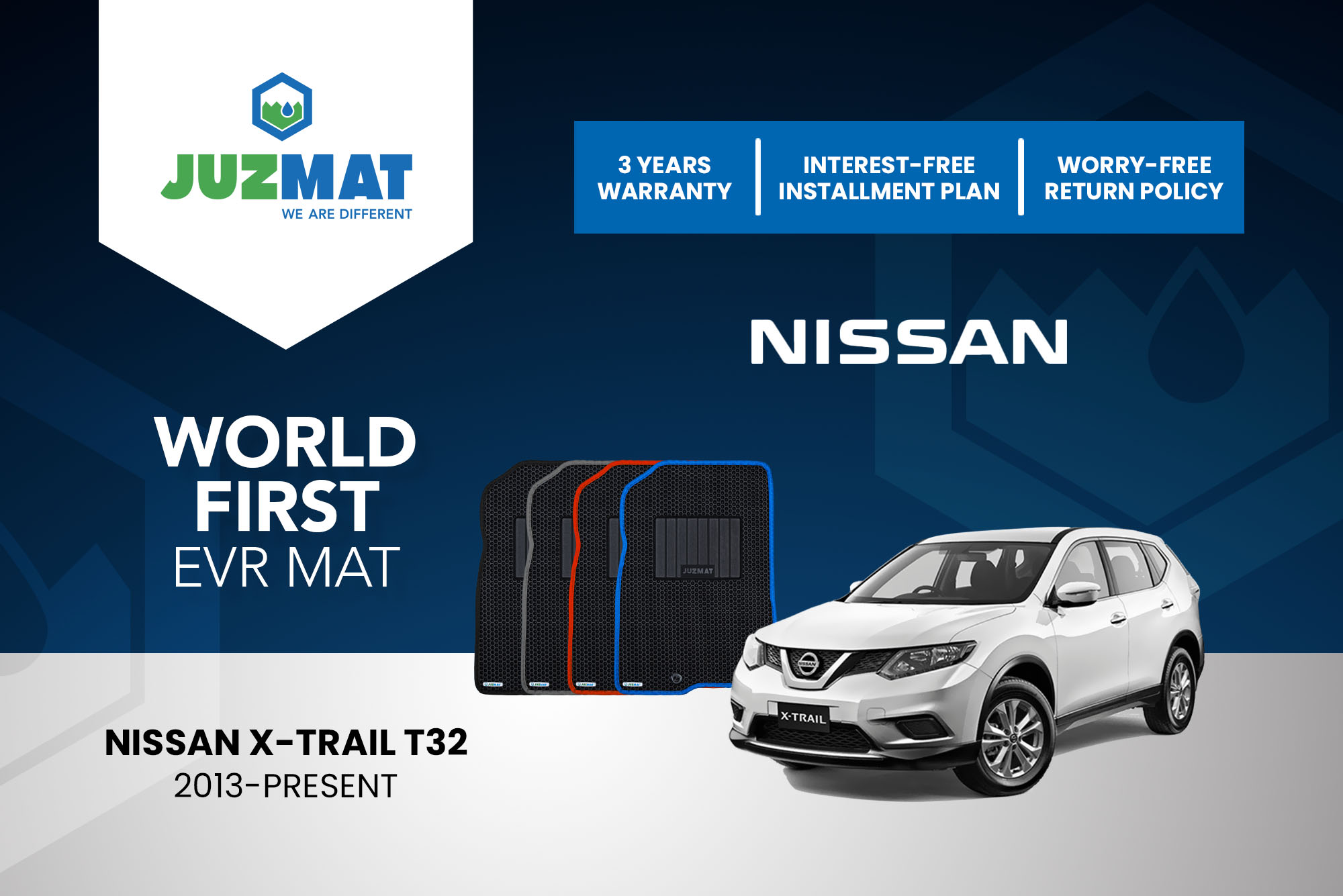 All our car mats are made to measure to ensure the perfect fit for your specific model. Juzmat EVR mat is 10x more durable than your regular mat. Shop confidently with our 3 years warranty promise!