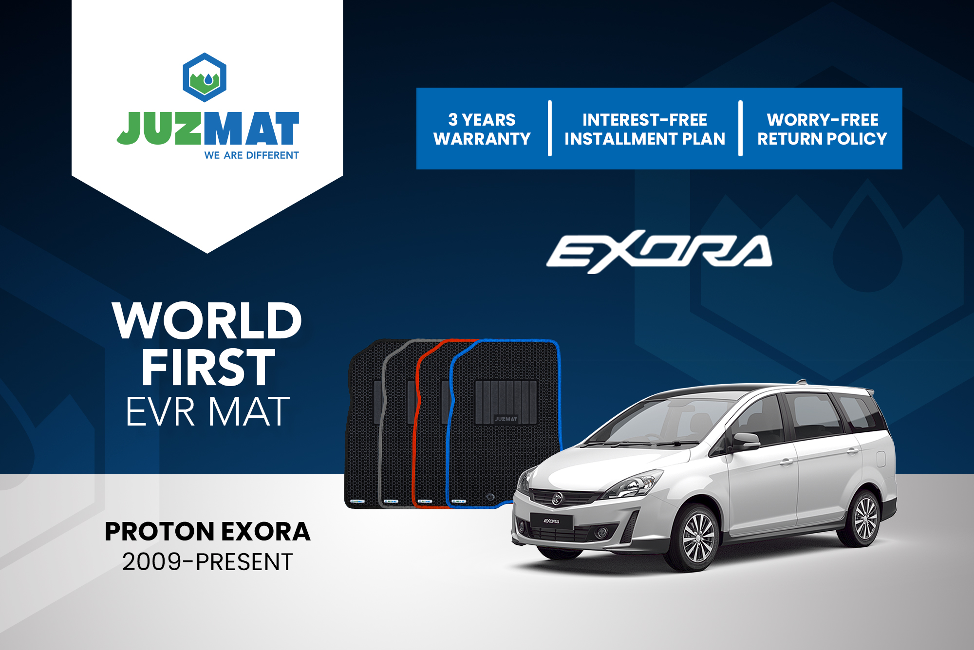 All our car mats are made to measure to ensure the perfect fit for your specific model. Juzmat EVR mat is 10x more durable than your regular mat. Shop confidently with our 3 years warranty promise!
