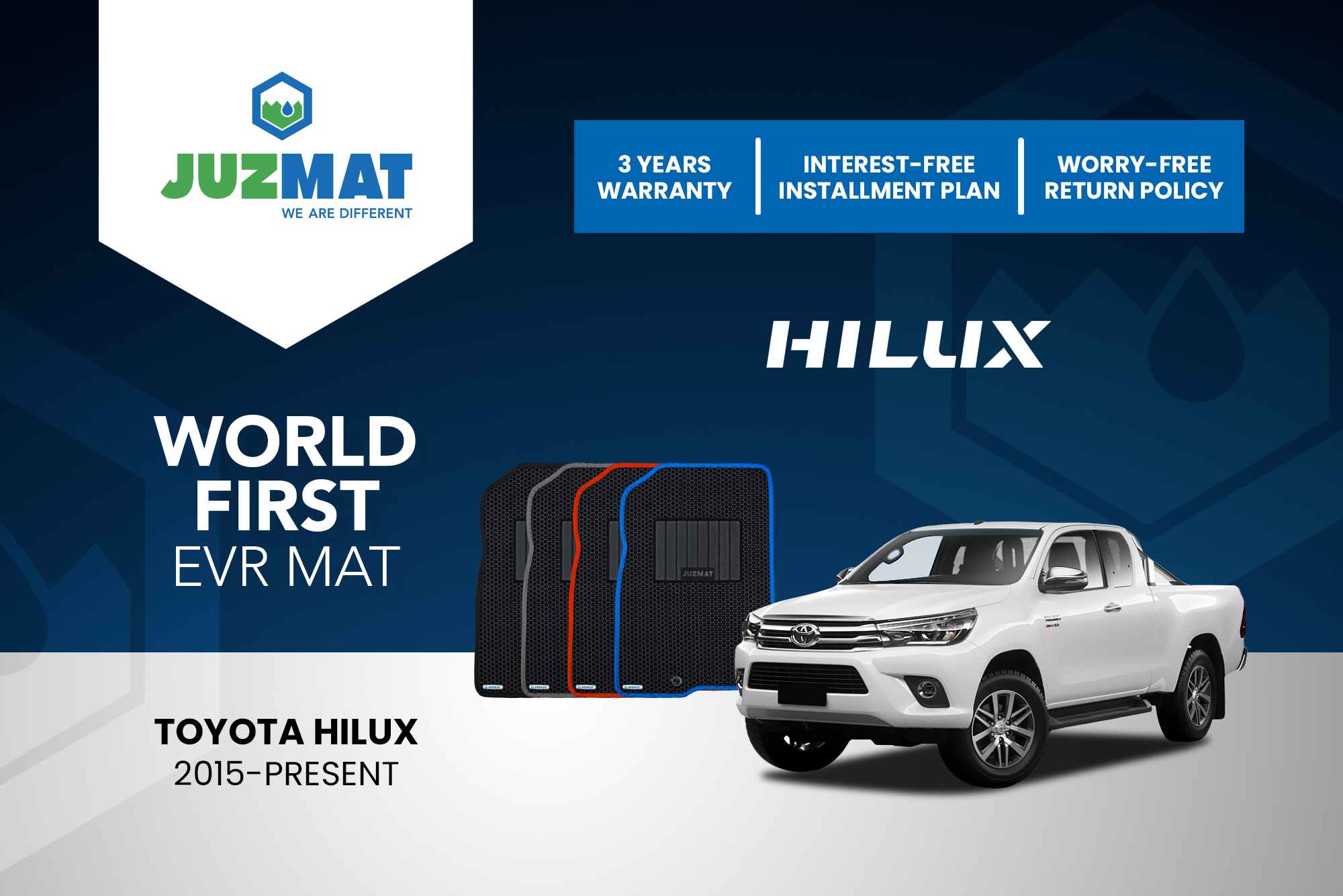 All our car mats are made to measure to ensure the perfect fit for your specific model. Juzmat EVR mat is 10x more durable than your regular mat. Shop confidently with our 3 years warranty promise!